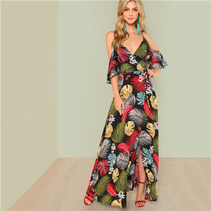 Floral Print Ruffle Open Shoulder Cami Long Dress