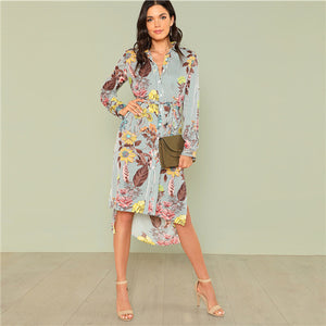 Floral Print Long Sleeve Blackless Chiffon Mini Dress