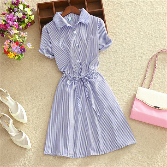 Office Summer Dress Shirt Elegant Blue Stripped Cotton Turn Down Collar Wear to Work Shirts Women Dresses