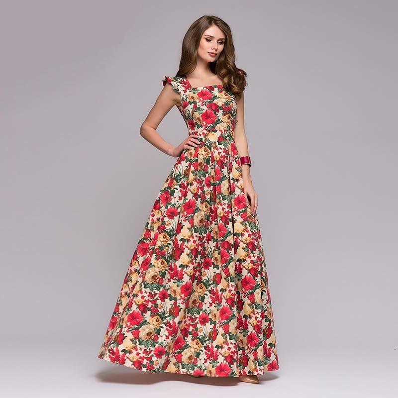 Women printing party dress Popular sleeveless square collar sexy long vestidos Women Elegant autumn pleated dress