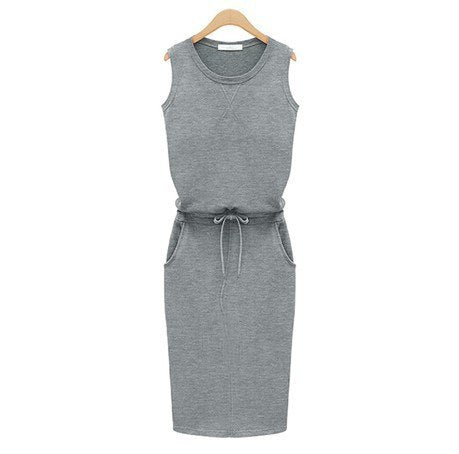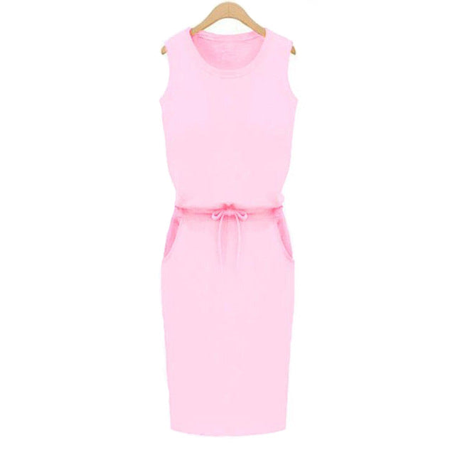 Summer Women Dress Fashion Solid Cotton Slim Fit Pockets Pencil Dresses Work Sleeveless Sexy Casual Dress Robe Femme