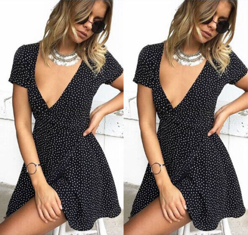 Deep Plung Polka dots Chiffon mini A line dress summer Beach sundress