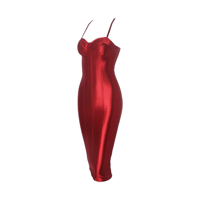 Sexy Spaghetti Straps Bodycon Red Party Dress Open Back Satin Gold Black Tight Package Hips Sleeveless Split Midi Dress