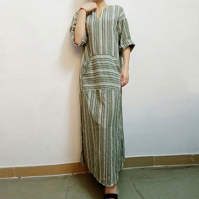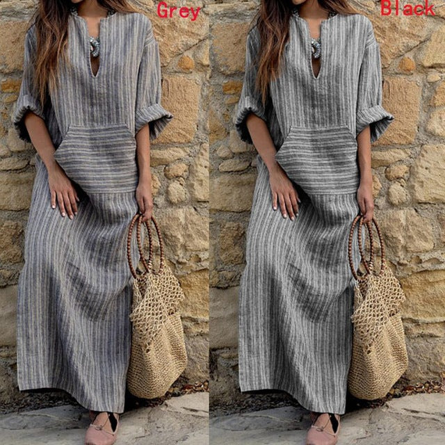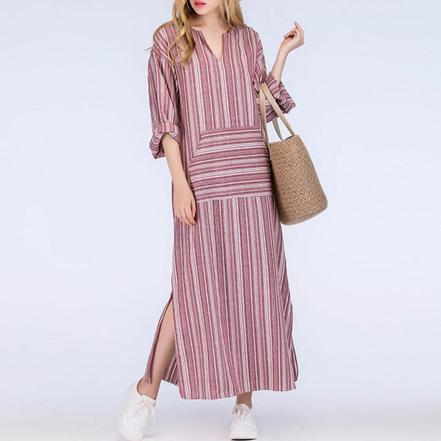 Women Striped Dress Sexy V Neck Long Sleeve Maxi Long Dresses Vintage Casual Loose Plus Size Vestidos